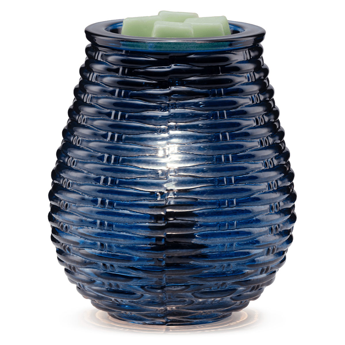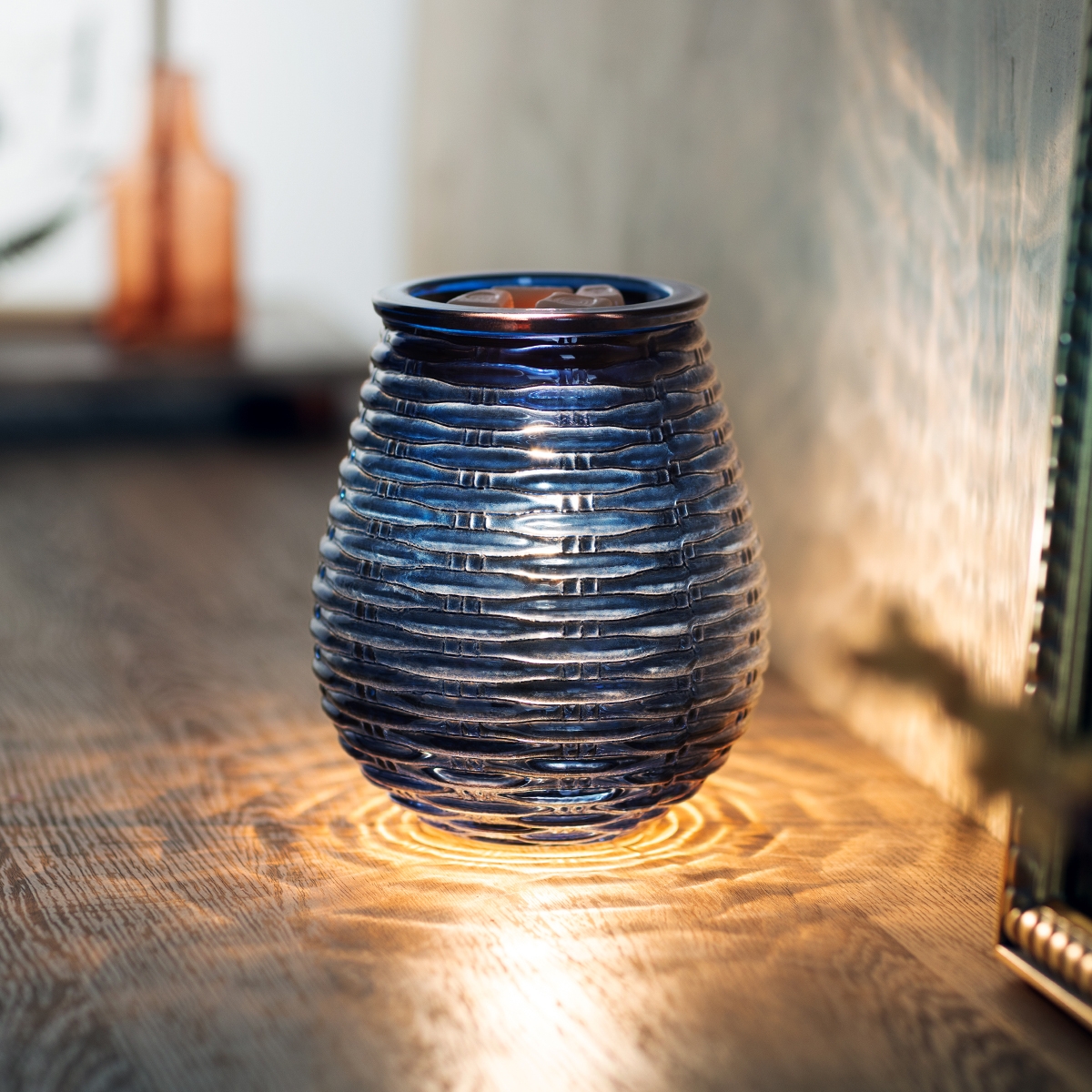 With this Azure Ripples Scentsy Warmer there is no need to blow out the candles—there are none as it’s an electric melt warmer! This electric wax warmer is even more stunning when the lights are off, and the glow from the wax warmer is cast on the walls.